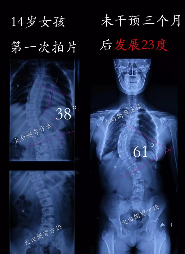 我們看到很多脊柱側彎發展的情況,例如:7天發展5度,3個月發展23度,5個月發展15度,3個月發展5度等。